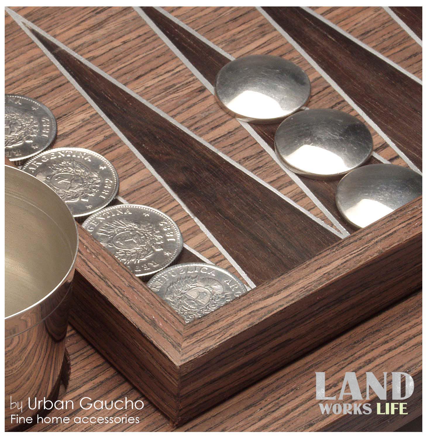 Backgammon diseñado combinando la antigua técnica de la marquetería con la madera de Palisandro, el itin y el acero inoxidable.