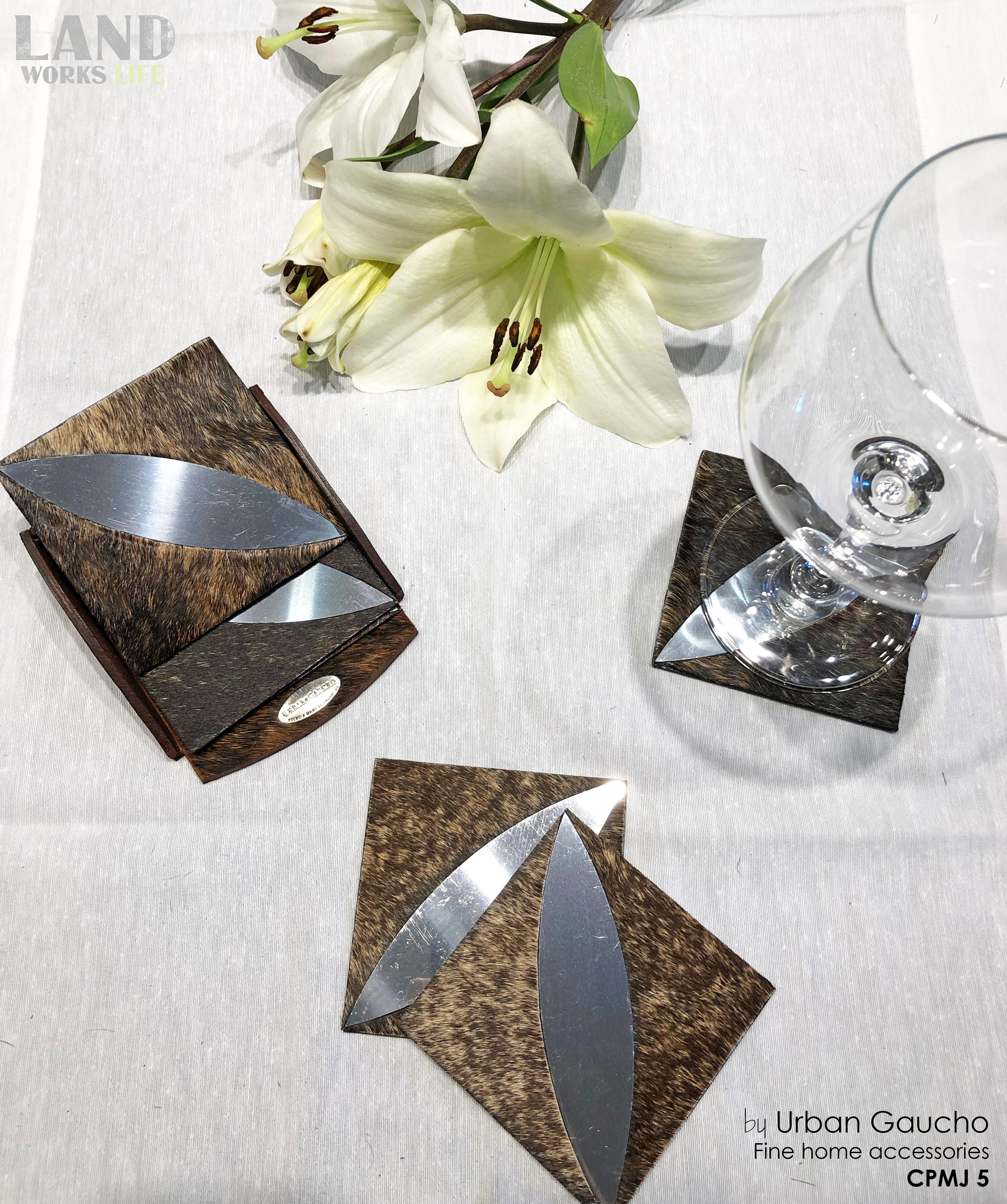 Set de posavasos de diseño de líneas contemporáneas hechos a mano combinando cueros con pelo naturales premium y diferentes diseños en acero inoxidable dando un producto que cumple con altos estándares de calidad.